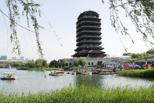 5月2日,游人在山東淄博齊盛湖泛舟游玩?!拔逡弧毙¢L假期間,人們來到各地景區游玩,樂享假期。新華社發(張進剛 攝)
