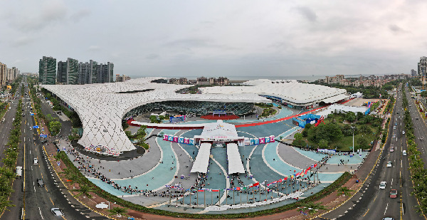 4月14日,觀眾有序排隊進場(無人機照片)。當日,第三屆中國國際消費品博覽會迎來社會公眾開放日,吸引觀眾前來觀看展覽、選購商品。