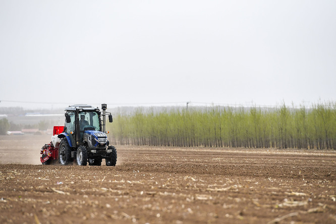 在吉林省四平市梨樹縣四棵樹鄉,農民駕駛農機進行春耕作業(4月20日攝)。新華社記者 張楠 攝