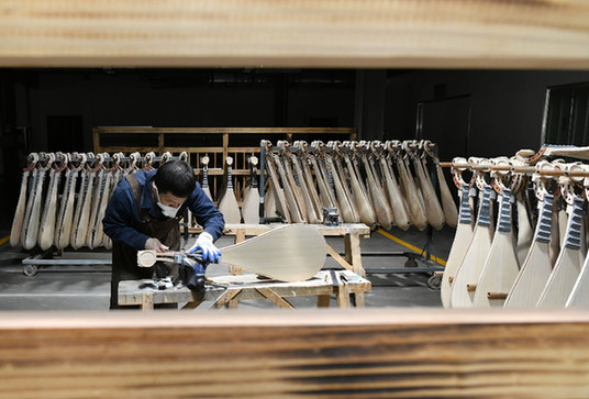 肅寧縣一家民族樂器生產企業的工人在生產車間內制作樂器。記者 牟宇 攝