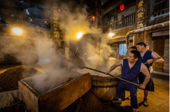 手工班釀造車間,工人正在出甄降溫,儲永志/攝