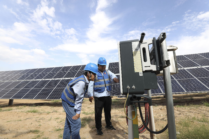 國家電投五凌電力余丁光伏電站職工在檢修設備。新華社記者 盧鷹 攝