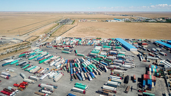 6月11日,二連浩特口岸旁的進出口物流園區中大量貨運卡車排隊準備出關(無人機照片)?!∮浾摺∨碓础z