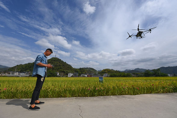 在浙江杭州市臨安區昌化鎮后營村,種糧大戶汪強操作農用無人機給水稻施肥(2022年9月21日攝)。新華社記者 徐昱 攝