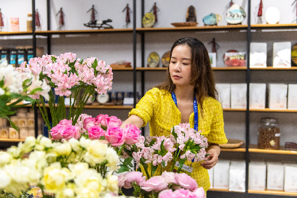 7月1日,中非經貿博覽會常設展館展區肯尼亞館館長黃梓楠在整理產自非洲的鮮花。