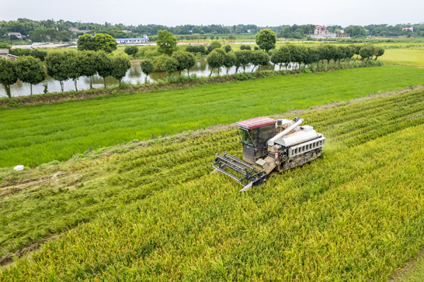 7月4日,在長沙市望城區茶亭鎮蘇蓼村,收割機在收割早稻。