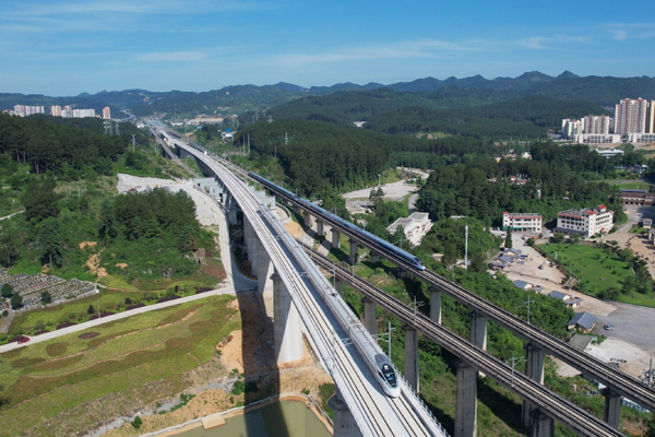 7月5日,參與試驗的55301次列車(左)行駛在貴州省龍里縣境內(無人機照片)。當日,55301次試驗列車從貴陽北站駛出,標志著貴南高鐵貴州段進入按圖行車試驗階段。按圖行車試驗是運行試驗的最后階段,主要對調度指揮、行車組織、列車到發和設備狀態等進行全方位、系統性測試。貴南高鐵是黔桂地區首條設計時速350公里的高速鐵路。建成通車后,從貴陽至南寧鐵路運行時間將從現在的5個多小時縮短至2個小時左右。