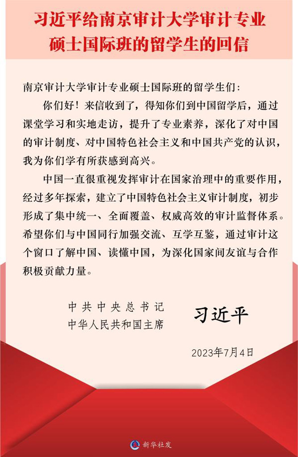 新華社北京7月5日電 中共中央總書記、國家主席習近平7月4日給南京審計大學審計專業碩士國際班的留學生回信,鼓勵他們為深化國家間友誼與合作積極貢獻力量。