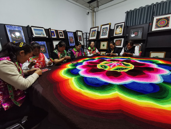 走進青繡數字化經濟總部刺繡車間,6位繡娘正圍坐在一張桌前,手中小小的繡花針靈巧地在布料上上下穿梭,一幅鋪滿整張桌子的土族盤繡初具形態。據繡娘介紹,這件巨幅作品前后共有十幾個人參與制作,歷經5年多的時間還未完工。完成后,它將作為青海的文化名片,讓大眾感受青繡之美。