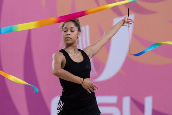第31屆世界大學生夏季運動會將于7月28日開幕,隨著賽事的臨近,各代表團選手來到各個項目的訓練場地,加緊適應性訓練。圖為7月25日,南非大學生藝術體操隊的選手在成都體育學院體操館訓練。