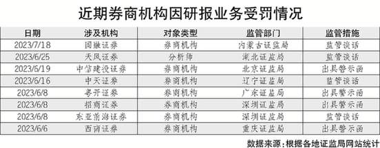券商研報業務整頓仍在持續進行。進入7月,仍有部分券商機構因研報業務違規受罰。自5月以來,全國各地證監局紛紛出手,針對二十余家違規券商機構及相關分析師開出近四十張罰單,問題包括研報結論缺乏數據支撐、無法保證信息來源真實性、研報業務內控制度不完善等。