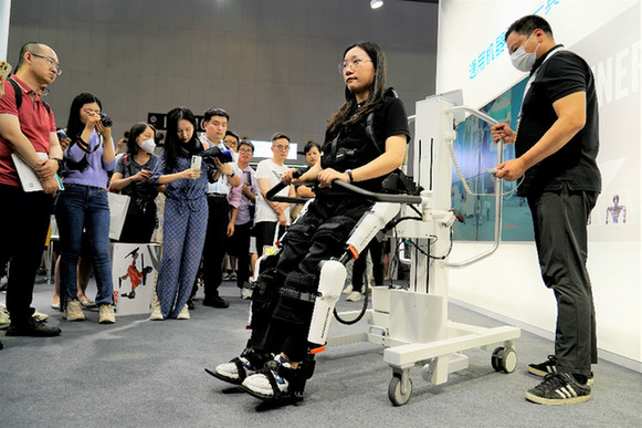 工作人員向參觀者演示傅利葉康復機器人康復訓練。 李心怡 攝