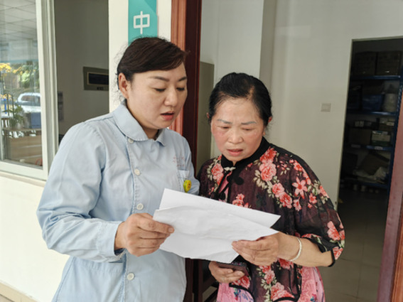 在成都回龍社區日間照料中心,成都八院護士喬雪蓮在給社區老人看體檢單?! ∮浾摺《〖t 攝