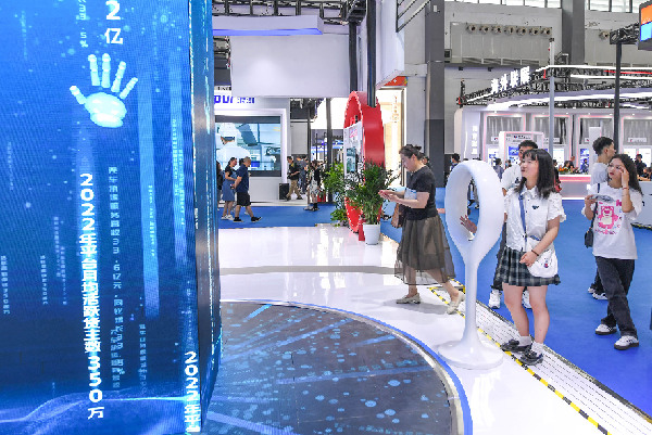 5月26日,2023中國國際大數據產業博覽會在貴陽市拉開帷幕,此次數博會以“數實相融 算啟未來”為年度主題,全面展示大數據技術在安全、政務、工業、醫療、交通、教育、文化旅游等行業的融合應用。圖為參觀者在數博會展館體驗“數據瀑布”抓取。資料照片