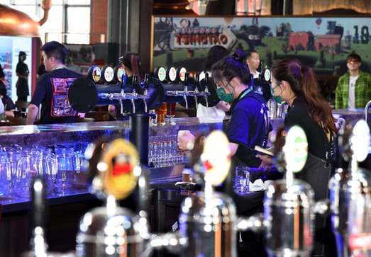 “打酒時,要用1.5L酒液沖洗酒管和售酒機,5℃純凈水噴沖玻璃杯,酒杯45度角傾斜放置,手持杯底三分之一處,出酒口距離杯子內壁高度固定于3厘米,啤酒泡沫與杯口平齊,高度占杯子高度的三分之一……這都是為了保證啤酒入口的品質更佳?!痹谇鄭u陽光百貨的TSINGTAO 1903青島啤酒吧內,侍酒師劉德謙對工作中的質量標準如數家珍。讓消費者對啤酒及氛圍的情緒感知,成為他們對質量的新追求。