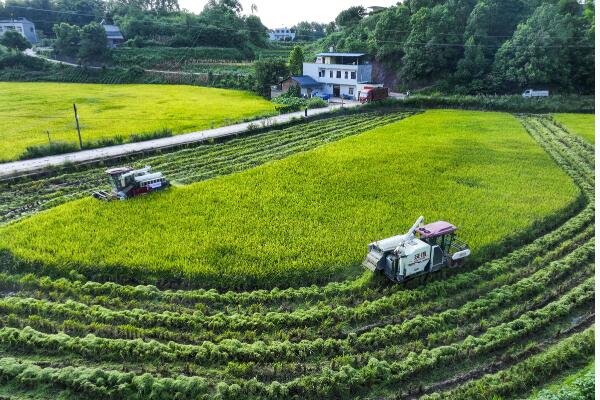 八月十三日在永川區吉安鎮金門村拍攝的水稻機械化收割作業現場(無人機照片)。永川區是重慶市糧食生產主產區之一,近年來,當地全面落實水稻種植補貼政策,統籌推進高標準農田建設,大力推廣農業生產機械化,強化農業技術服務,切實保障糧食安全,促進農民持續增收。新華社記者 王全超 攝