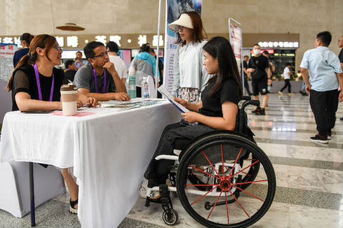 求職者在山東省殘疾人就業專場招聘會上咨詢崗位信息。資料照片
