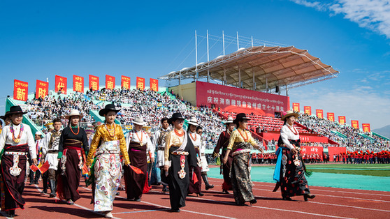 8月1日,青海省海南藏族自治州舉行慶祝成立70周年大會。海南州民族體育場彩旗飄飄,歌聲悠揚,各族群眾身著盛裝,滿懷喜悅。新華社記者 解統強 攝