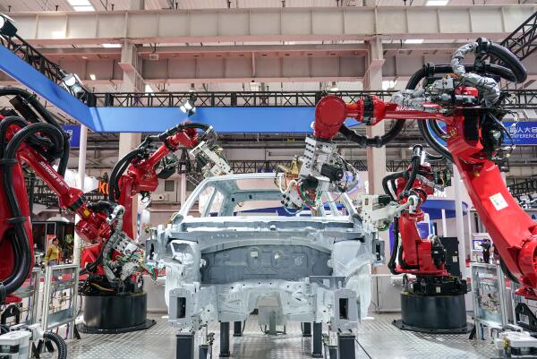 這是8月16日拍攝的白車身焊點機器人工作站。當日,2023世界機器人大會在北京開幕,本次大會的主題為“開放創新 聚享未來”,包含論壇、博覽會、機器人大賽等活動。