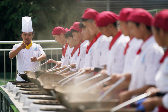 在位于西安市藍田縣的藍田廚師學校,教師成曉強(左一)指導學生們練習翻勺。新華社記者 李一博 攝