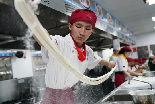 在位于西安市藍田縣的藍田廚師學校中式面點實訓室,學生在練習制作面條。新華社記者 李一博 攝