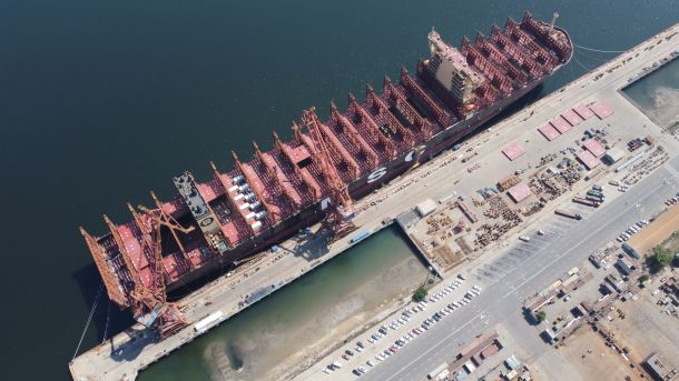 這是中船(天津)船舶制造有限公司廠區一艘已經下水準備交付的船舶(無人機照片)。記者 趙子碩 攝