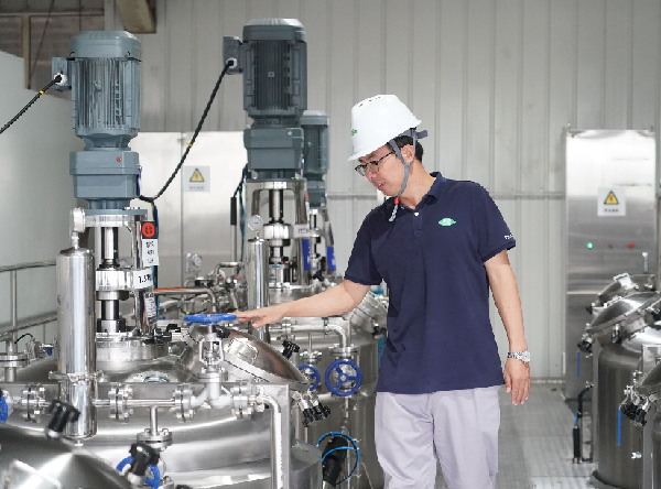 “和傳統的化工生產線相比,我們的生產線顯得過于簡潔,這恰恰是優勢?!蔽嫻S董事長徐絢明指著背后的生產線向記者介紹,因為不用傳統化工產業的嚴格無菌、高壓環境,對水和能源的消耗也降低50%以上。
