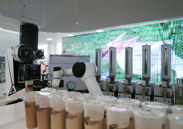 淄博市臨淄區的遨博(山東)智能機器人有限公司,機器人在制作奶茶。新華社記者 張浩波 攝