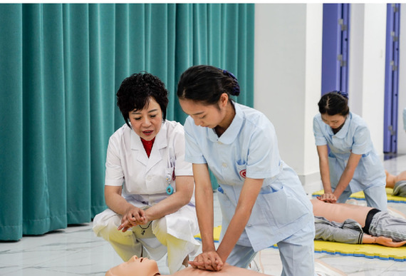 張先庚(左一)在護理實訓室指導學生做急救操作?! ±钽腓z