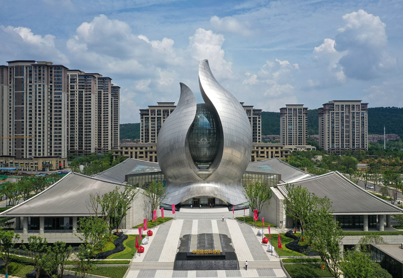 中間高起猶如破土而出的“種子”,被水波狀的“葉片”包裹著向天際延伸,合院環繞其四周,仿佛一幅建筑山水的絕妙圖景,點亮整個光谷。位于武漢東湖高新區的中國建筑科技館,在藍天白云映襯下格外搶眼。暑期,這里成為青少年觀眾游覽、研學的最佳選擇之一。