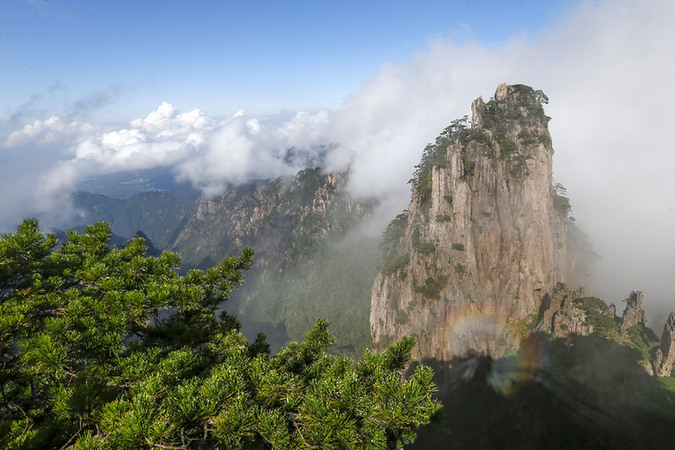 當日,雨后初霽的安徽省黃山風景區出現秋日迷人的藍天云海,在陽光的照耀下,罕見的“佛光”在云海中若隱若現,與奇峰相映成趣。