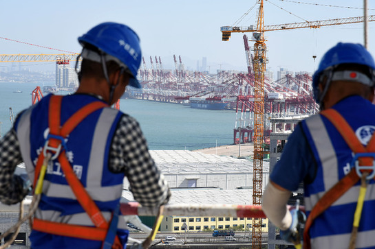 國慶長假期間,在位于中國(山東)自由貿易試驗區青島片區的航運貿易金融融合創新基地項目上,600多名建設者堅守一線,搶抓施工黃金期,奮力沖刺項目建設關鍵節點。圖為中鐵建工建設者在進行外墻吊裝施工準備。新華社記者 李紫恒 攝