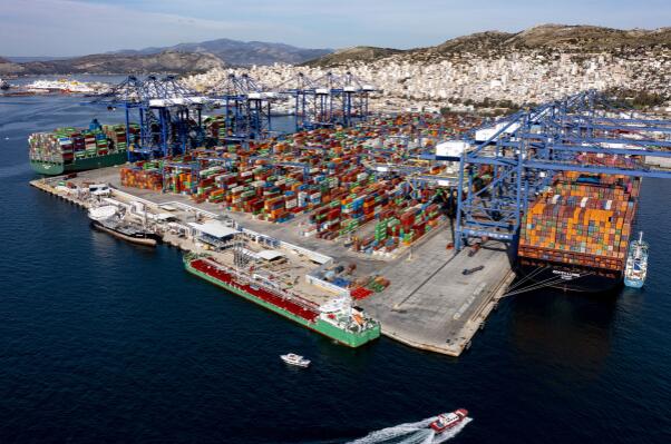圖為2022年2月19日拍攝的希臘比雷埃夫斯港集裝箱3號碼頭(無人機照片)。作為“一帶一路”倡議的典范項目,希臘比雷埃夫斯港年貨物吞吐量增至500萬標箱以上,躍升為歐洲第四大集裝箱港口、地中海領先集裝箱大港。新華社發(中遠海運港口比雷埃夫斯碼頭有限公司供圖)