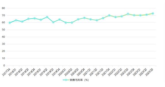 ????值得一提的是,珀萊雅單季銷售毛利率亦創下上市以來新高。同花順IFinD數據顯示,2017年第四季度至2022年第二季度,珀萊雅單季銷售毛利率一直在70%之下徘徊,2022年第三季度至2023年第三季度,珀萊雅單季銷售毛利率分別為71.99%、70.14%、70.03%、70.90%、72.66%,可見,珀萊雅今年第三季度銷售毛利率創上市以來最高值。