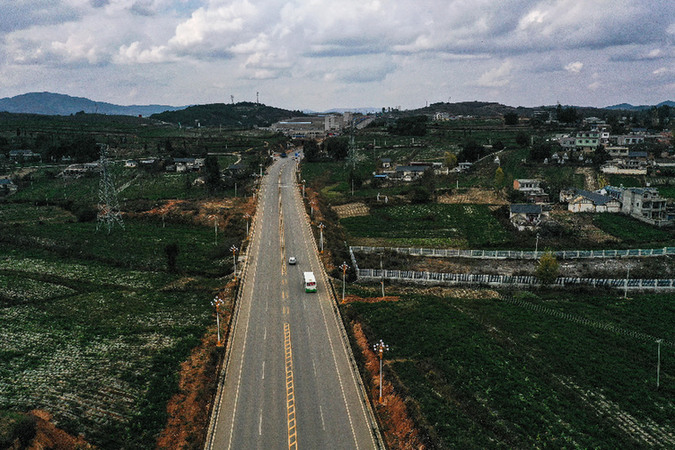 鄉鎮公交車行駛在貴州省威寧縣迤那鎮開往牛棚鎮的公路上(無人機照片)。資料照片