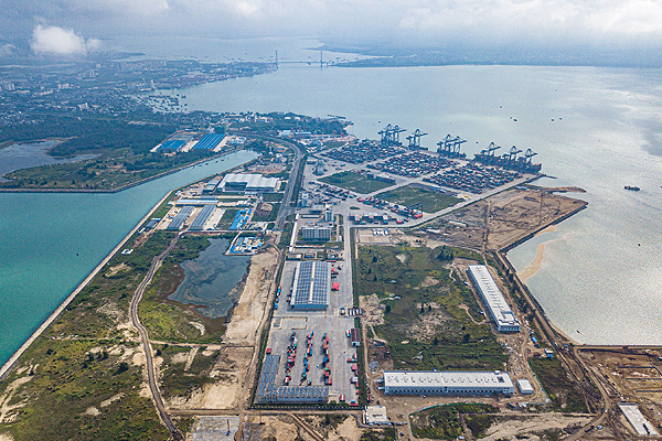 10月25日拍攝的洋浦港封關運作項目和洋浦國際集裝箱碼頭(無人機照片)?!逗D献杂少Q易港建設總體方案》明確,海南將在2025年前適時啟動全島封關運作。目前,項目土建工程即將完工,工人們正在進行水電安裝等施工。