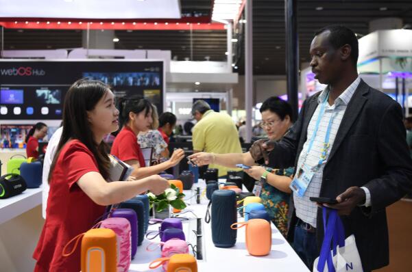 在第134屆廣交會上,來自蘇丹的采購商在智能音箱展臺洽談。新華社記者 鄧華 攝