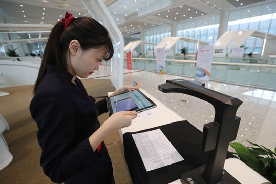 中國(遼寧)自由貿易試驗區沈陽片區“渾南會客廳”內,工作人員在幫助企業上傳文件。記者 楊青 攝