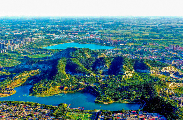 從水泊梁山風景區上空俯瞰梁山縣城周邊全貌