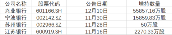 《經濟參考報》記者注意到,11月以來,除興業銀行外,寧波銀行、蘇州銀行、蘭州銀行等也相繼獲得股東增持。