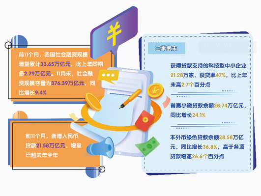 12月13日人民銀行披露的數據顯示,前11個月,我國社會融資規模增量累計33.65萬億元,比上年同期多2.79萬億元。與此同時,前11個月貸款增量達21.58萬億元,已超去年全年。在貨幣政策總量和結構性工具合力支持下,金融助力實體經濟恢復向好,科技創新、綠色低碳等重點領域企業資金“獲得感”也有所增強。