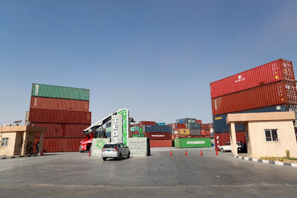 在埃及蘇伊士省的中?!ぬ┻_蘇伊士經貿合作區拍攝的泰達保稅倉庫和二手車交易中心。資料照片