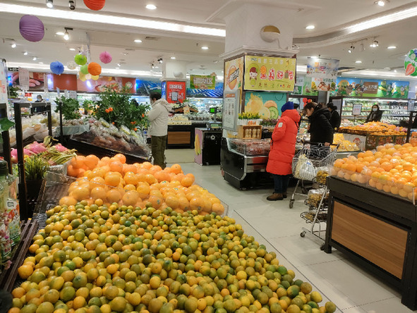 圖為哈爾濱哈爾信超市內,蔬菜、水果供應充足。 新華社記者 朱悅 攝