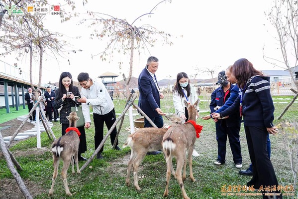 在中國梅花鹿(西豐)現代農業產業園,參觀人員在與小鹿互動。(受訪者供圖)