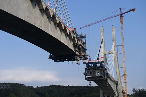 圖為在廣西南寧南深高鐵南玉段六律邕江特大橋建設現場,中鐵十四局集團工人在建設施工中。新華社記者 陸波岸 攝