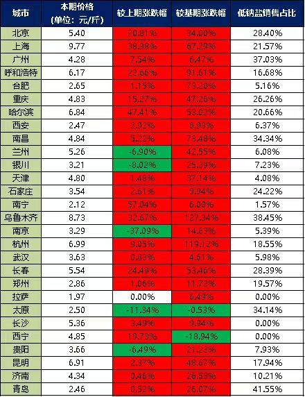 分價格區間來看,本期超市食用鹽銷售單價在5元/斤以上的城市有10個,分別是北京、上海、呼和浩特、哈爾濱、蘭州、烏魯木齊、杭州、長春、長沙、昆明;超市食用鹽銷售單價在4-5元/斤之間的城市有6個,分別是廣州、重慶、南昌、天津、西寧、濟南;超市食用鹽銷售單價在3-4元/斤之間的城市有5個,分別是銀川、石家莊、南京、武漢、貴陽;超市食用鹽銷售單價在3元/斤以下的城市有7個,分別是合肥、西安、南寧、鄭州、拉薩、太原、青島。