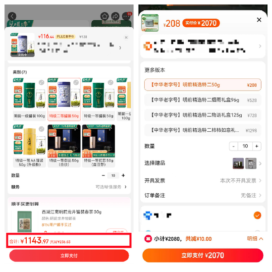 目前市場上在售的特等二級洞庭山碧螺春,市場流通價每斤3000元左右,京東超市同等級產品核算成“斤價”僅在1200元左右,而某購物平臺同每斤售價2080元,比京東超市貴了80%多。