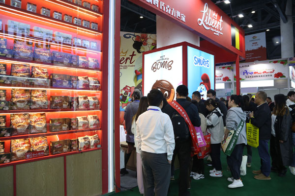 在10號館進口食品展區,比利時國家(商品)館邀請了一家比利時巧克力廠設立展位?!斑@里的人真的非常多。比利時是以巧克力、啤酒、鉆石和藍精靈聞名的國家,而我們是唯一能使用藍精靈IP的巧克力廠家,所以大家對我們的產品非常感興趣?!边@家比利時巧克力廠的負責人莉莉·利比特表示。