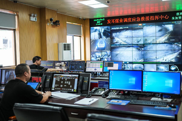 2018年,發耳煤礦在貴州率先建成智能化綜采工作面,成為貴州省第一家實現綜采工作面智能化、生產輔助系統信息化的礦井。圖為4月1日,發耳煤業工作人員在調度應急救援指揮中心工作。記者 陶亮 攝
