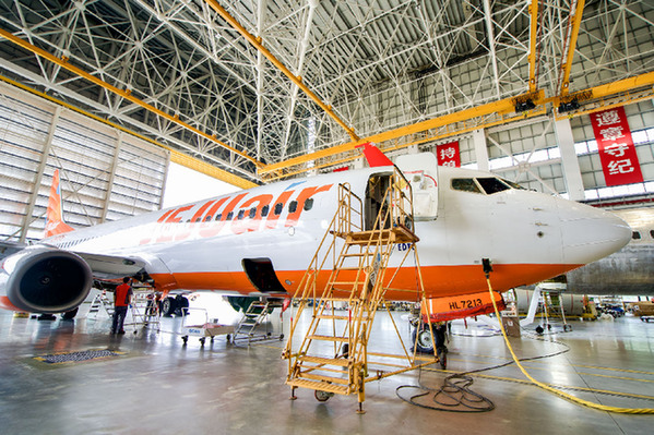 一架來自韓國濟州航空公司的波音737-800飛機來到海南自貿港一站式飛機維修產業基地定檢機庫內,接受海航技術旗下大新華飛機維修服務有限公司提供的專項維修服務。 新華社記者 張麗蕓 攝